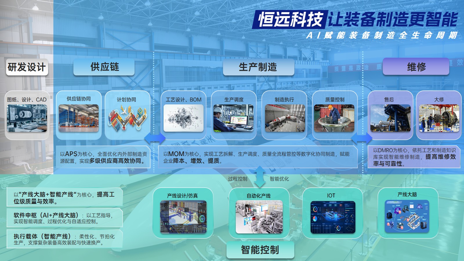 基于智能制造核心能力,恒遠(yuǎn)科技橫向延伸打造裝備全生命周期總集服務(wù),構(gòu)建產(chǎn)業(yè)鏈數(shù)字化協(xié)同平臺(tái)與覆蓋設(shè)備大修維護(hù)的全維運(yùn)維保障體系,形成貫穿研發(fā)設(shè)計(jì)、供應(yīng)鏈協(xié)同、生產(chǎn)制造到售后維修的完整價(jià)值鏈。